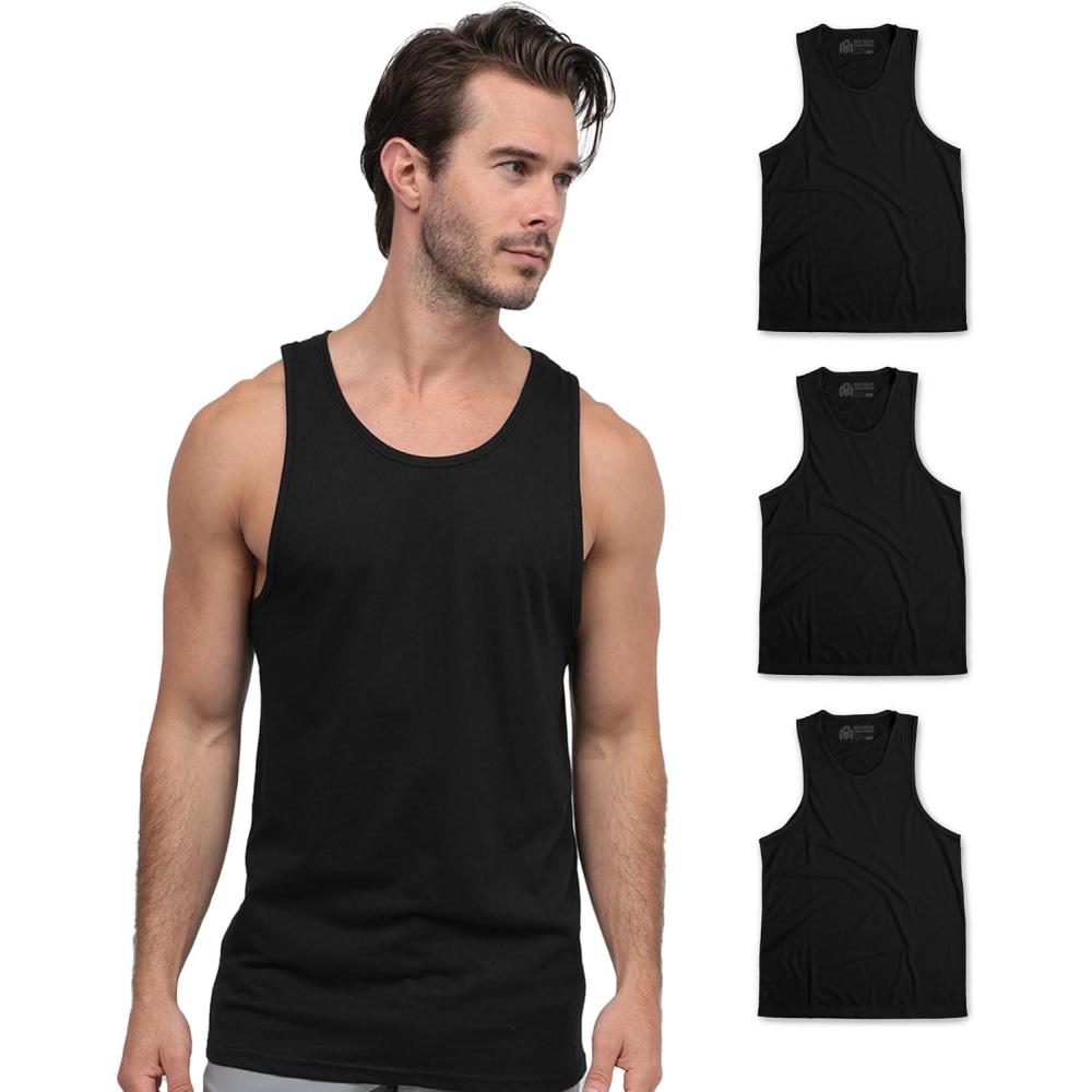 INTO THE AM Basic Tank Tops for Men – Minimal Plain Tanks for Beach Exercise Casual Wear S – 2XL(3-pack Non-branded – Black/Black/Black)