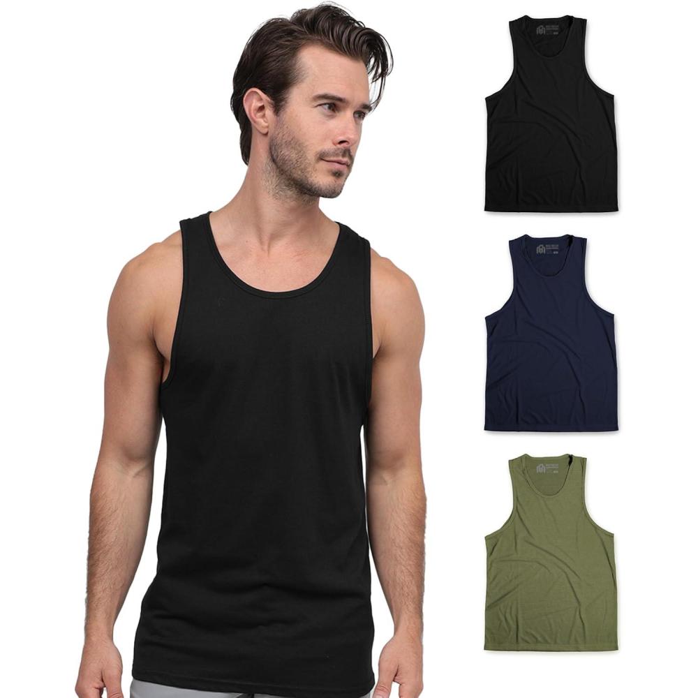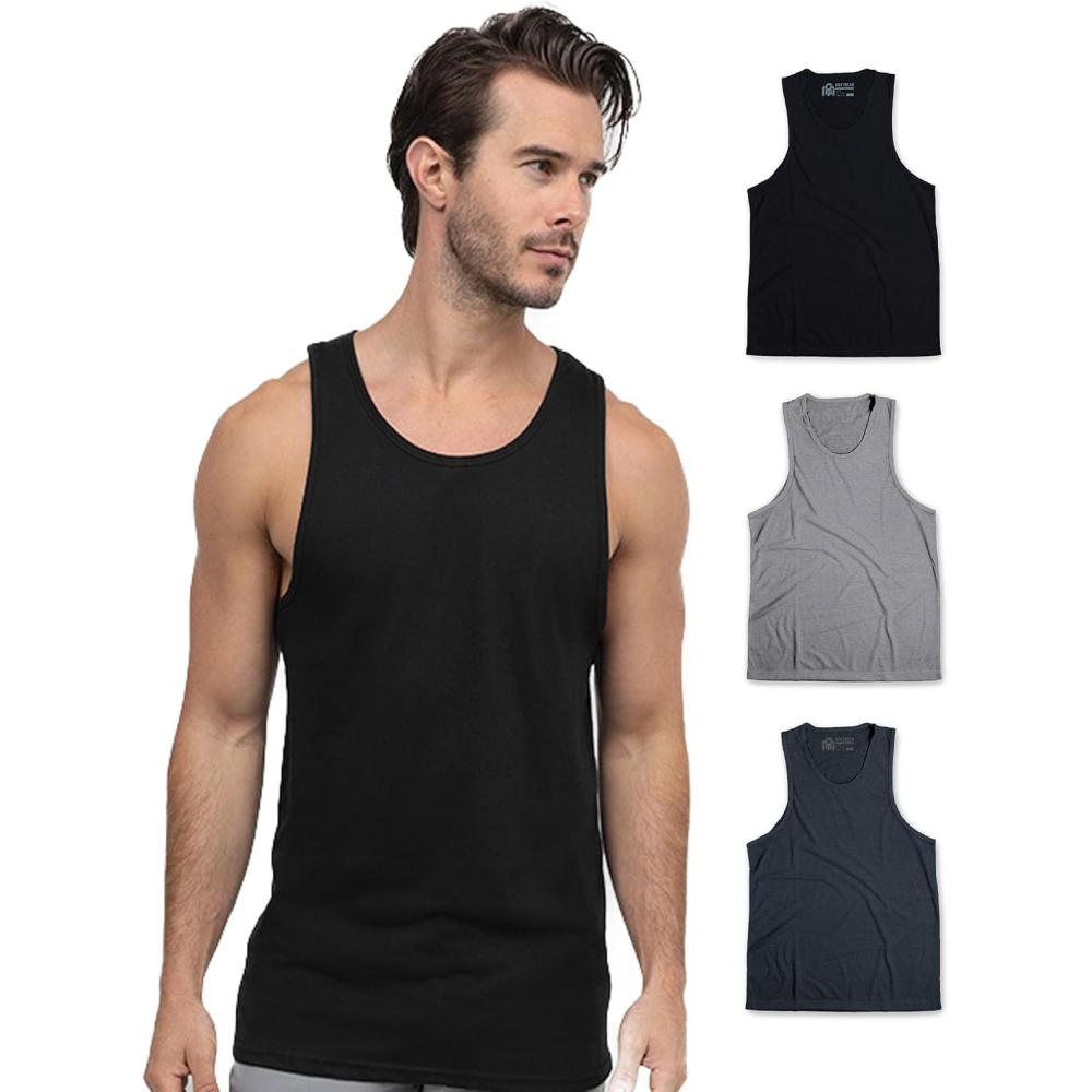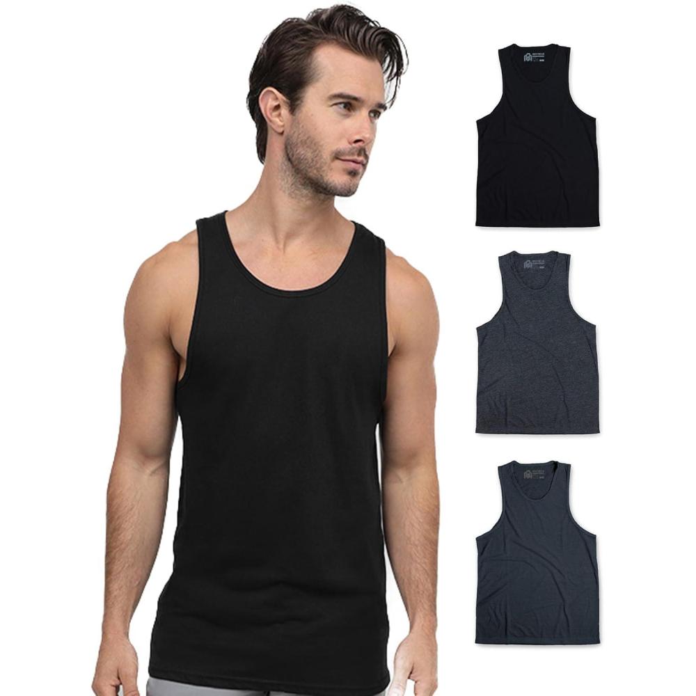 INTO THE AM Basic Tank Tops for Men – Minimal Plain Tanks for Beach Exercise Casual Wear S – 2XL(3-pack Non-branded – Black/Grey/Navy)